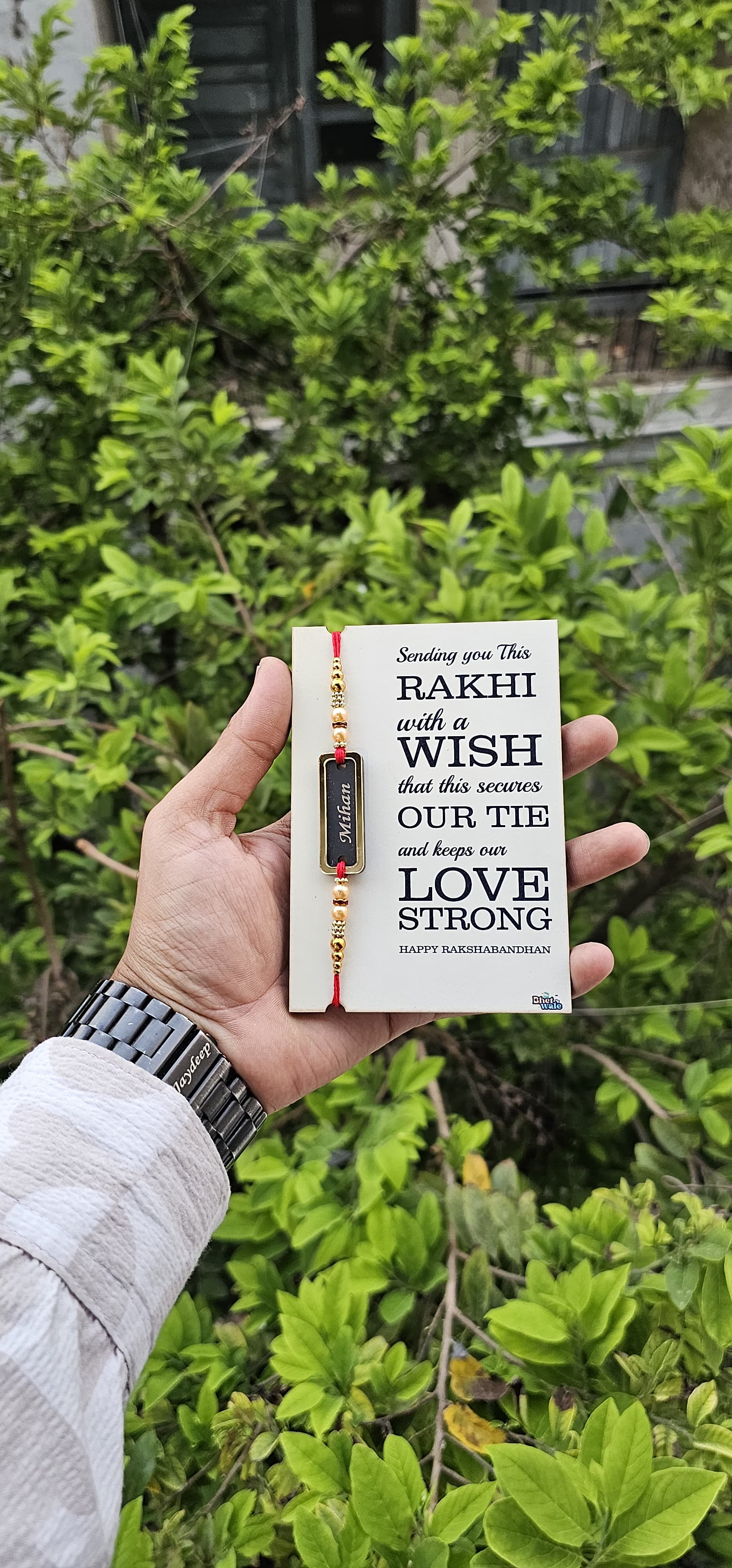 Celebrate Raksha Bandhan with a stylish twist! This combo includes a customized name rakhi made from elegant black acrylic with golden framing, paired with a premium MDF message card. Personalize the rakhi with your brother’s name and add a heartfelt message on the wooden card – the perfect blend of tradition and emotion.