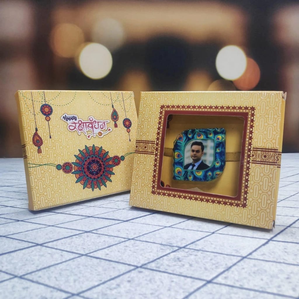 Celebrate the vibrant bond you share with our Peacock Feather Personalized Photo Crystal Rakhi. Featuring a stunning peacock feather design and a customizable crystal photo holder, this Rakhi is both beautiful and unique. It's a perfect way to show your love and make this Raksha Bandhan truly special.